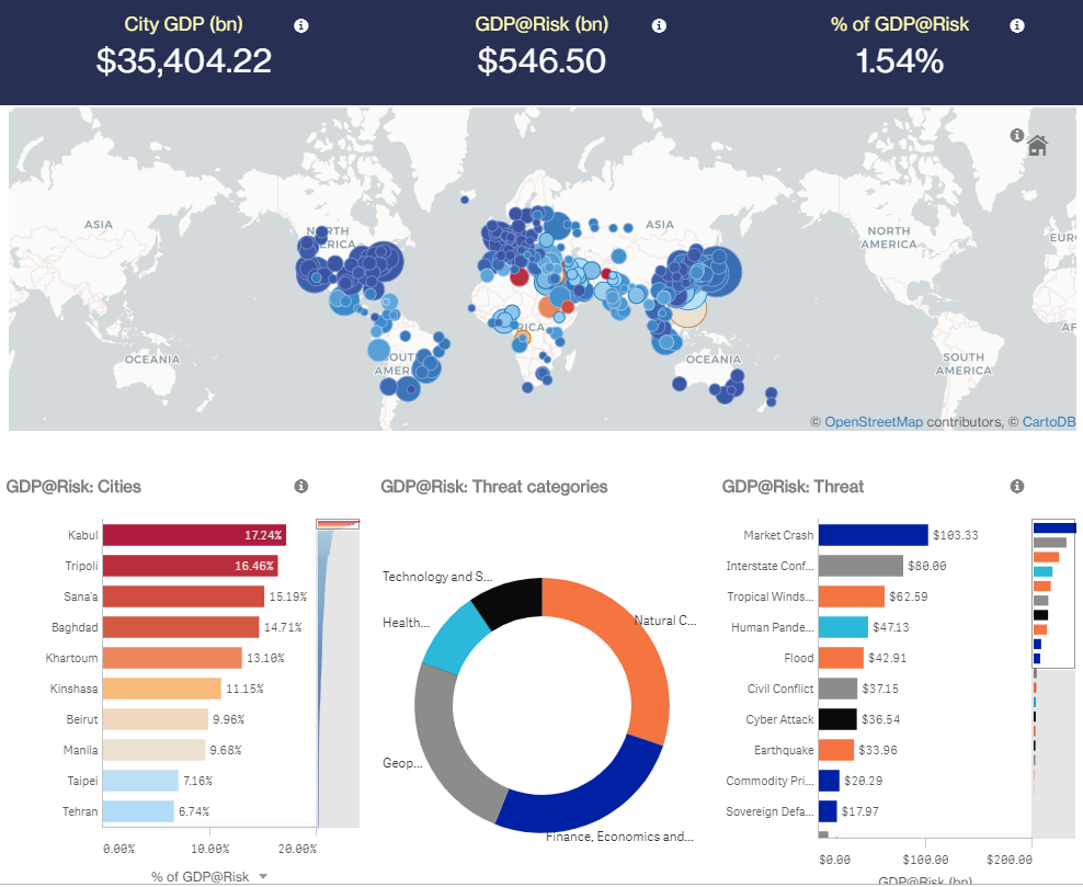 Σύμφωνα με τον εν λόγω δείκτη, που έρχεται να μετρήσει κινδύνους σε περισσότερες από 300 μεγαλουπόλεις παγκοσμίως, το ΑΕΠ της Αθήνας ανέρχεται σε 96,99 δις δολάρια και ο βασικότερος κίνδυνος είναι η κατάρρευση της αγοράς που μπορεί να οδηγήσει σε απώλειες 0,67 δις δολαρίων.