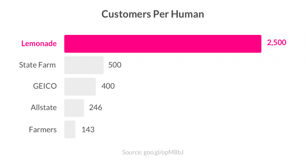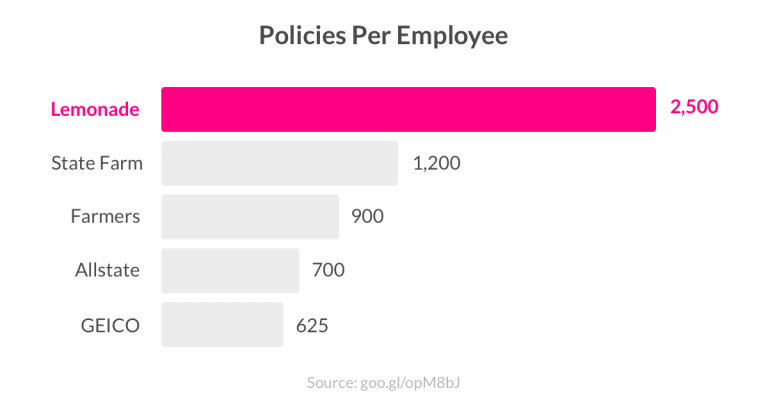 Όπως αναφέρει στην ανακοίνωση της η Lemonade έχει σημαία να δούμε πόσα συμβόλαια ανά εργαζόμενο έχουν οι ασφαλιστικές, καθώς οι πιο αποδοτική ασφαλιστική εμφανίζεται να έχει 1.200 συμβόλαια ανά υπάλληλο.