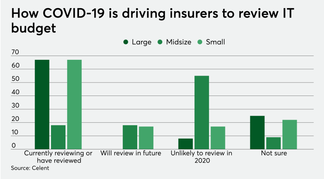 Όπως φαίνεται από έρευνα της Celent περίπου 7 στις 10 μεγάλες ασφαλιστικές έχουν ήδη αναθεωρήσει ή βρίσκονται στη διαδικασία αναθεώρησης του budget στο ΙΤ, περίπου 2/10 θα το αναθεωρήσουν στο μέλλον και μόλις 1/10 εταιρείες δεν έχει σκοπό να αναθεωρήσει τα σχέδια της.