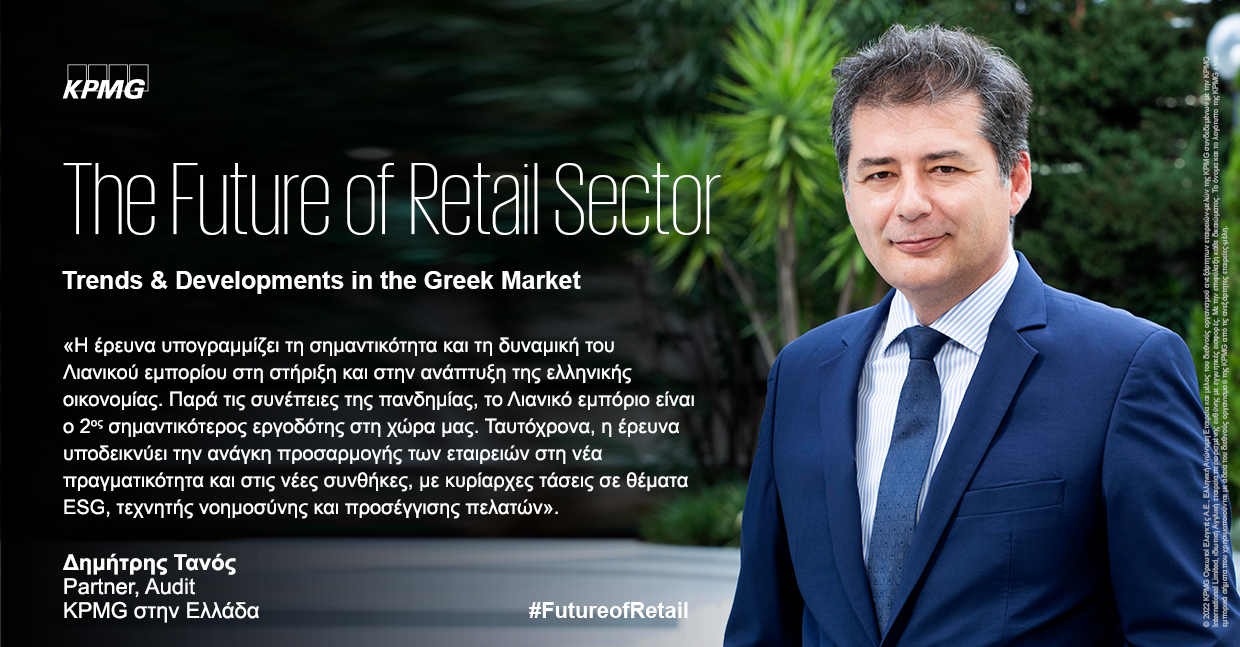 Η μελέτη “The Future of Retail Sector” που πραγματοποίησε η KPMG στην Ελλάδα διερευνά τη δομή, το μέγεθος και την ανάπτυξη του κλάδου του Ελληνικού Λιανικού εμπορίου, όπως επίσης και τις χρηματοοικονομικές τάσεις. Επιπλέον, παρουσιάζει μια πιο λεπτομερή ανάλυση κάθε υποτομέα του Λιανικού εμπορίου, μέσω χρηματοοικονομικών μεγεθών, για τους πιο σημαντικούς παίκτες της αγοράς. Η έρευνα επίσης, εστιάζει στη μελλοντική πορεία του κλάδου, τονίζοντας τις τάσεις του λιανικού εμπορίου, τις συμπεριφορές των καταναλωτών καθώς και τις τεχνολογίες που θα διαμορφώσουν τις προοπτικές του κλάδου.