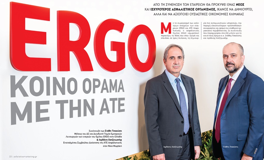 Σε συνέντευξη που παραχώρησαν στο ΑΜ οι κ. Στάθης Τσαούσης και Ιορδάνης Χατζηιωσήφ μιλούν για το κοινό όραμα του ομίλου και το συγκερασμό των καλύτερων στοιχείων των ERGO και ATE. Στο αναδιπλούμενο εξώφυλλο του ΑΜ ο Όμιλος μεταφέρει το μήνυμα ότι η επόμενη μέρα για τους ασφαλισμένους και τους συνεργάτες θα αναδείξει τα καλύτερα στοιχεία της προηγούμενης και θα θέσει τις βάσεις για την περαιτέρω ανάπτυξη.