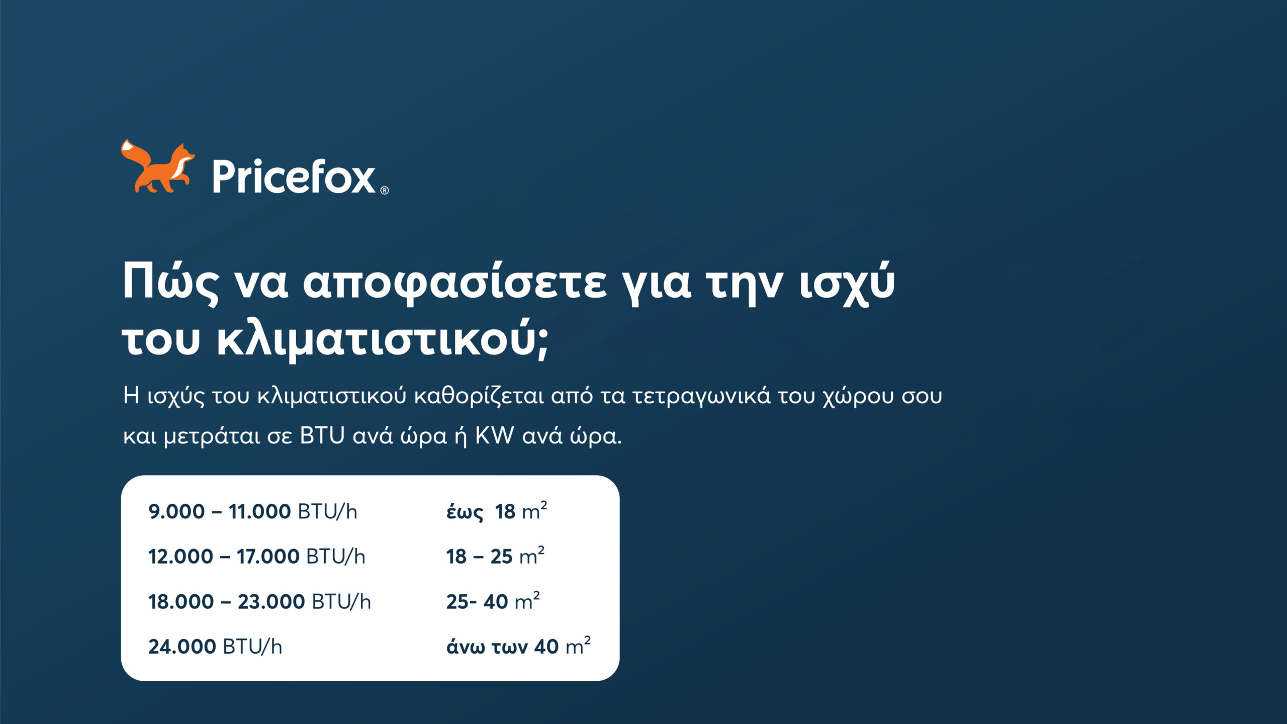 Η ισχύς του κλιματιστικού καθορίζεται από τα τετραγωνικά του χώρου σου και μετράται σε BTU ανά ώρα ή KW ανά ώρα.