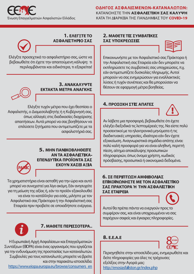 Οδηγό κατανόησης της ασφαλιστικής κάλυψης, κατά τη διάρκεια της πανδημίας του κορωνοϊού Covid-19 δημιούργησε η ΕΕΑΕ.