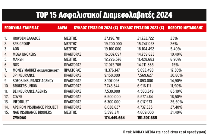 Σκοπός αυτής της λίστας είναι να έχουμε μια πιο επικαιροποιημένη εικόνα της αγοράς από τα δημοσιευμένα στοιχεία στο ΓΕΜΗ που δυστυχώς παρουσιάζουν – για όποιον τα συλλέξει και τα επεξεργαστεί – την εικόνα προ διετίας. Τα οικονομικά στοιχεία που παρουσιάζουμε είναι κατά προσέγγιση και κατά δήλωση των ίδιων των εταιρειών με τις οποίες ήρθαμε σε επικοινωνία και για αυτό θα παρατηρήσετε ότι κάποιες εταιρείες που υπάρχουν στη λίστα με τους μεγαλύτερους Μεσίτες & Πράκτορες με στοιχεία του 2023, δεν υπάρχουν εδώ. Αυτές είναι οι εταιρείες Mondial Assistance, Carpenter Turner, Πειραιώς Agency Solutions, Insurance Beat, ΝΝ Πρακτορειακή & Aegean Πρακτορειακή που για δικούς τους – σεβαστούς λόγους – δεν μας κοινοποίησαν τα οικονομικά τους στοιχεία.