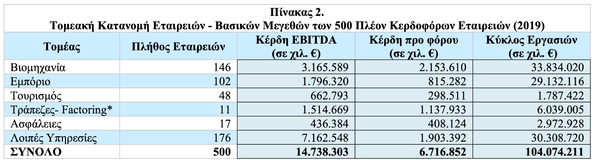 Από πλευράς πλήθους εταιρειών, οι επιχειρήσεις που ανήκουν στον τομέα των «Λοιπών Υπηρεσιών» και στον Βιομηχανικό κυριαρχούν ανάμεσα στις top 500 πιο κερδοφόρες το 2019, καλύπτοντας μερίδιο 35,2% και 29,2% αντίστοιχα, επί του συνόλου των εταιρειών.