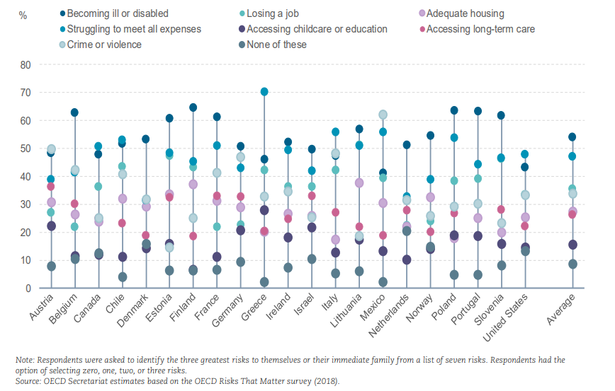Κατά μέσο όρο στις 21 χώρες του ΟΟΣΑ οι μισοί πολίτες αναφέρουν ότι το να αρρωστήσουν ή να χάσουν τη δουλειά τους είναι ένας από τους βασικούς τρεις κινδύνους που μπορεί να αντιμετωπίσει η οικογένειά τους μέσα στο επόμενο ένα ή δύο έτη. Αυτή είναι η πιο κοινή ανησυχία σε 14 από τις 21 χώρες, συμπεριλαμβανομένων ορισμένων χωρών με ιδιαίτερα ανεπτυγμένα συστήματα κοινωνικής προστασίας, όπως το Βέλγιο, η Φινλανδία και η Γαλλία.