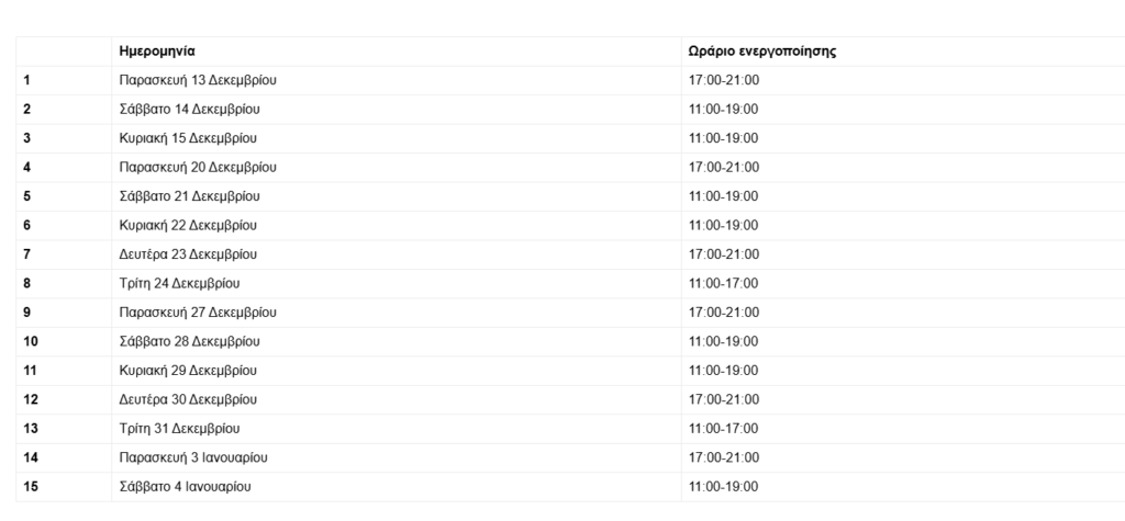 Προκειμένου όσο το δυνατόν περισσότεροι επισκέπτες να έχουν την ευκαιρία να γίνουν «Καλαντιστές» και να διεκδικήσουν τα υπέροχα δώρα, η χριστουγεννιάτικη ενέργεια της Eurolife FFH στα EurolifeHub θα διαρκέσει για 15 ολόκληρες μέρες, με το πρόγραμμα να διαμορφώνεται ως εξής: