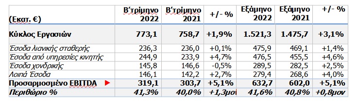 Το Β’ τρίμηνο του 2022, τα ενοποιημένα έσοδα του Ομίλου OTE αυξήθηκαν κατά 2,7% και διαμορφώθηκαν σε €849,6 εκατ. Στην Ελλάδα, τα έσοδα αυξήθηκαν κατά 1,9%, στα €773,1 εκατ., αντανακλώντας την αυξημένη βάση σύγκρισης λόγω των πωλήσεων επιδοτούμενων συσκευών που πραγματοποιήθηκαν το Β’ τρίμηνο του 2021. Οι ισχυρές επιδόσεις στην Κινητή, την Τηλεόραση και στις υπηρεσίες ICT συνεχίστηκαν στο τρίμηνο, ενώ σημειώθηκε ανάκαμψη στα έσοδα από περιαγωγή. Στη Ρουμανία, τα έσοδα αυξήθηκαν κατά 4,7% και διαμορφώθηκαν στα €78,2 εκατ., καθώς τα έκτακτα έσοδα από υπηρεσίες MVNO μαζί με τα υψηλότερα έσοδα από πωλήσεις συσκευών υπεραντιστάθμισαν την πτώση των εσόδων από υπηρεσίες κινητής τηλεφωνίας λόγω της μείωσης στα τέλη τερματισμού (MTR). Τα συνολικά λειτουργικά έξοδα του Ομίλου, εξαιρουμένων των αποσβέσεων, των απομειώσεων και των επιβαρύνσεων που σχετίζονται με κόστη αναδιοργάνωσης (κυρίως Προγράμματα Εθελούσιας Αποχώρησης) και μη επαναλαμβανόμενες νομικές υποθέσεις, παρέμειναν σταθερά, παρά την αύξηση στο κόστος ενέργειας. Η προσαρμοσμένη κερδοφορία EBITDA (AL) του Ομίλου αυξήθηκε κατά 7,2% σε €332,8 εκατ., οδηγώντας σε ένα περιθώριο 39,2%. Στην Ελλάδα, η προσαρμοσμένη κερδοφορία EBITDA (AL) σημείωσε αύξηση 5,1%, στα €319,1 εκατ., και το περιθώριο EBITDA ανήλθε στο 41,3%, υψηλότερο κατά 130 μονάδες βάσης. Η κινητή στην Ρουμανία κατέγραψε προσαρμοσμένη κερδοφορία EBITDA (AL) €13,7 εκατ., επηρεασμένη θετικά από έκτακτες προσαρμογές.