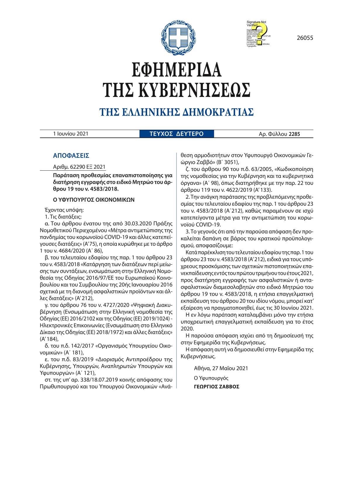 ΦΕΚ: Απευθείας διαβίβαση του Συμβολαίου Αστικής Ευθύνης και της Βεβαίωσης Επαναπιστοποίησης των ασφαλιστικών διαμεσολαβητών στα μητρώα των Επιμελητηρίων