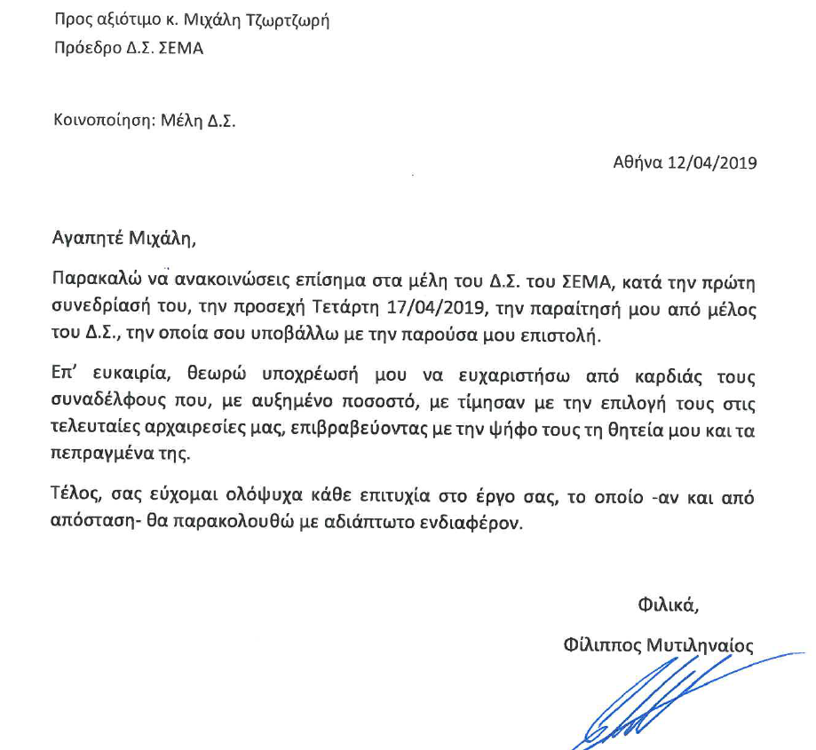 Την παραίτηση του από το ΣΕΜΑ έχει ήδη κοινοποιήσει στα μέλη του ΔΣ του συνδέσμου ο Φίλιππος Μυτιληναίος. Στην επιστολή του ο κ. Μυτιληναίος ευχαριστεί τους συναδέλφους του που τον τίμησαν με την ψήφο τους στις τελευταίες αρχαιρεσίες και εύχεται καλή επιτυχία στο έργο του ΣΕΜΑ.