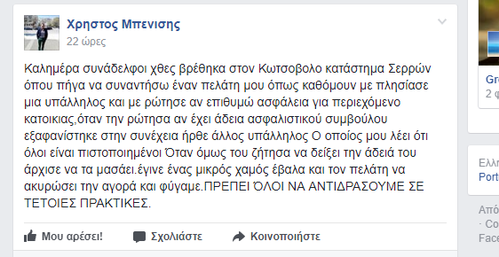 Και αναμφίβολα η υπόθεση χρήζει διερεύνησης για την προστασία του καταναλωτή που πρέπει όταν ασφαλίζεται να έχει απέναντι του έναν πιστοποιημένο ασφαλιστή, ο οποίος θα φέρει και την ευθύνη που απορρέει από την άσκηση του επαγγέλματός του. Τότε θα μπορούμε να μιλάμε για διαφάνεια και για το πως μπορεί να δημιουργηθεί στον καταναλωτή η εικόνα του υπεύθυνου επαγγελματία διαμεσολαβητή, που έχει όλα τα εχέγγυα και τις γνώσεις για αυτό που προτείνει. Το θέμα που αναδείχθηκε στο facebook όπως αναφέρεται στο μέσο κοινωνικής δικτύωσης αφορά τον Κωτσόβολο και σας το παραθέτουμε: