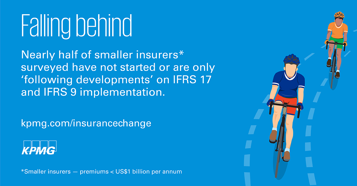 Συγκριτικά, μεταξύ των πιο μικρών ασφαλιστικών εταιρειών (με ασφάλιστρα κάτω των US$1 δις.), μόνο το δέκα και το εικοσιπέντε τοις εκατό έχουν ξεκινήσει τη σχεδίαση ή την εφαρμογή των προτύπων IFRS 17 και IFRS 9, αντίστοιχα. Ωστόσο, παρόλη την πρόοδο που έχουν σημειώσει πολλές ασφαλιστικές εταιρείες, παραμένουν σημαντικά εμπόδια στην εφαρμογή των IFRS 17 και IFRS 9. Ενενήντα τοις εκατό των ασφαλιστικών εταιρειών δήλωσαν ότι προβλέπουν δυσκολίες στο να εξασφαλίσουν επαρκές εξειδικευμένο προσωπικό για τη συγκεκριμένη δουλειά και οι μισοί ανησυχούν για την εξασφάλιση του απαραίτητου προϋπολογισμού. «Παραδόξως, διαπιστώνουμε ότι οι οργανισμοί που έχουν προχωρήσει πιο πολύ με τα έργα τους αισθάνονται την πιο μεγάλη χρονική πίεση» δήλωσε η Mary Trussell, Global Insurance Change Leader της KPMG International. «Όσο περισσότερα βήματα κάνουν, τόσο συνειδητοποιούν το πόσο απαιτητικό θα είναι να εφαρμόσουν τα νέα πρότυπα.