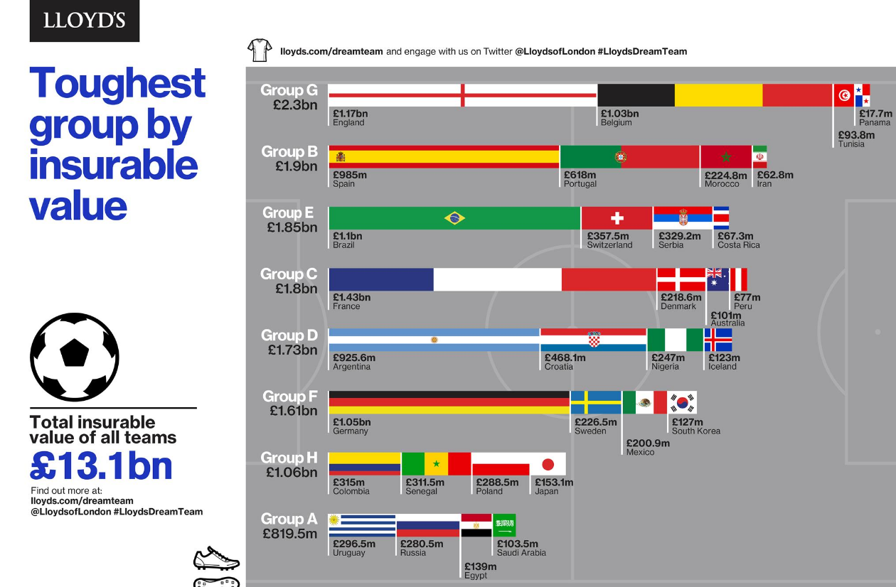 Όταν οι αρμόδιοι στους Lloyd’s και το Cebr ρωτήθηκαν γιατί αποφάσισαν να κάνουν την ανάλυση αυτή, ένας εκπρόσωπος του Lloyd’s δήλωσε ότι “γιατί ήταν πραγματικά διασκεδαστικό”. Στην κατάταξη των ομάδων του φετινού Παγκόσμιου Κυπέλλου της FIFA, οι Lloyd’s αναφέρουν ότι σύμφωνα με την έρευνα τρεις χώρες έχουν τις πιο ακριβές ομάδες από άποψη ασφαλιστικής αξίας: η ομάδα της Γαλλίας (1,9 δισ. δολάρια), της Αγγλίας (1,6 δισ. δολάρια) και της Βραζιλίας (1,5 δισ. δολάρια).