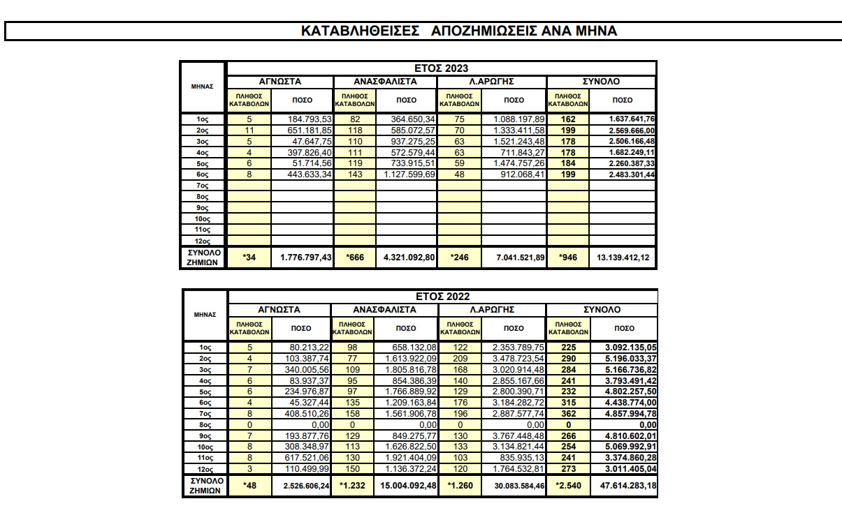 Μεγάλα είναι τα ποσά των αποζημιώσεων τα οποία έχει επίσης καταβάλλει το ίδιο διάστημα το Επικουρικό Κεφάλαιο και αφορούν σε υποθέσεις προηγούμενων ετών. Το 2022 το ΕΚ έδωσε για 1232 ζημιές 15 εκατ. ευρώ και στο πρώτο εξάμηνο του 2023 για 666 ζημιές 4,3 εκατ. ευρώ. Ειδικότερα μέσα στο προηγούμενο έτος το Μάρτιο και το Νοέμβριο καταγράφονται οι μεγαλύτερες συνολικές καταβολές 1,8 εκατ. ευρώ και 1,9 εκατ. ευρώ αντίστοιχα.