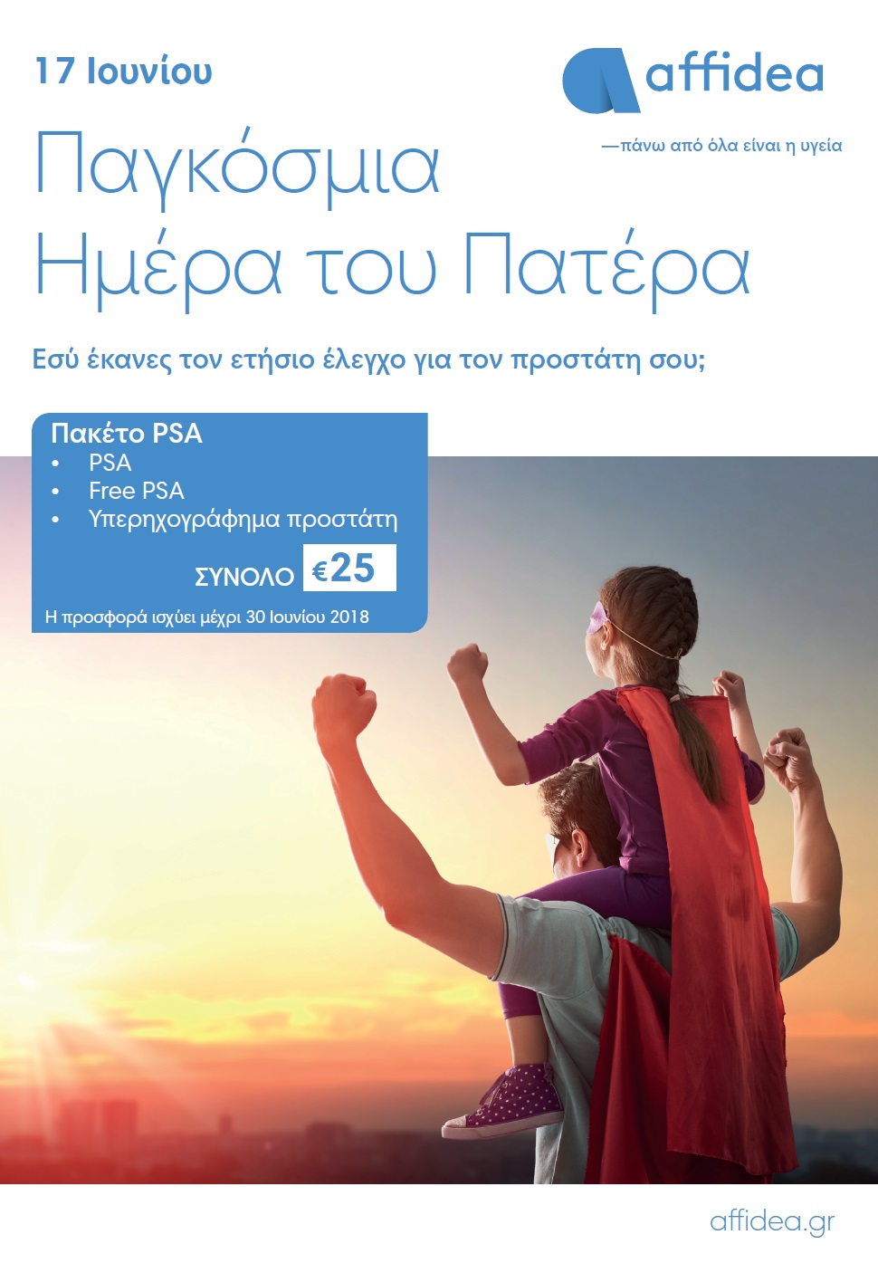Ο Όμιλος Διαγνωστικών Εργαστηρίων Αffidea, επιθυμώντας να συμβάλει στην προαγωγή υγείας του ανδρικού πληθυσμού, με αφορμή την Παγκόσμια Ημέρα του Πατέρα την Κυριακή 17 Ιουνίου, προσφέρει ολοκληρωμένο πακέτο προληπτικού ελέγχου του προστάτη, δίνοντας στους άνδρες τη δυνατότητα να ελέγξουν την υγεία του προστάτη αδένα τους, σε προνομιακή τιμή.