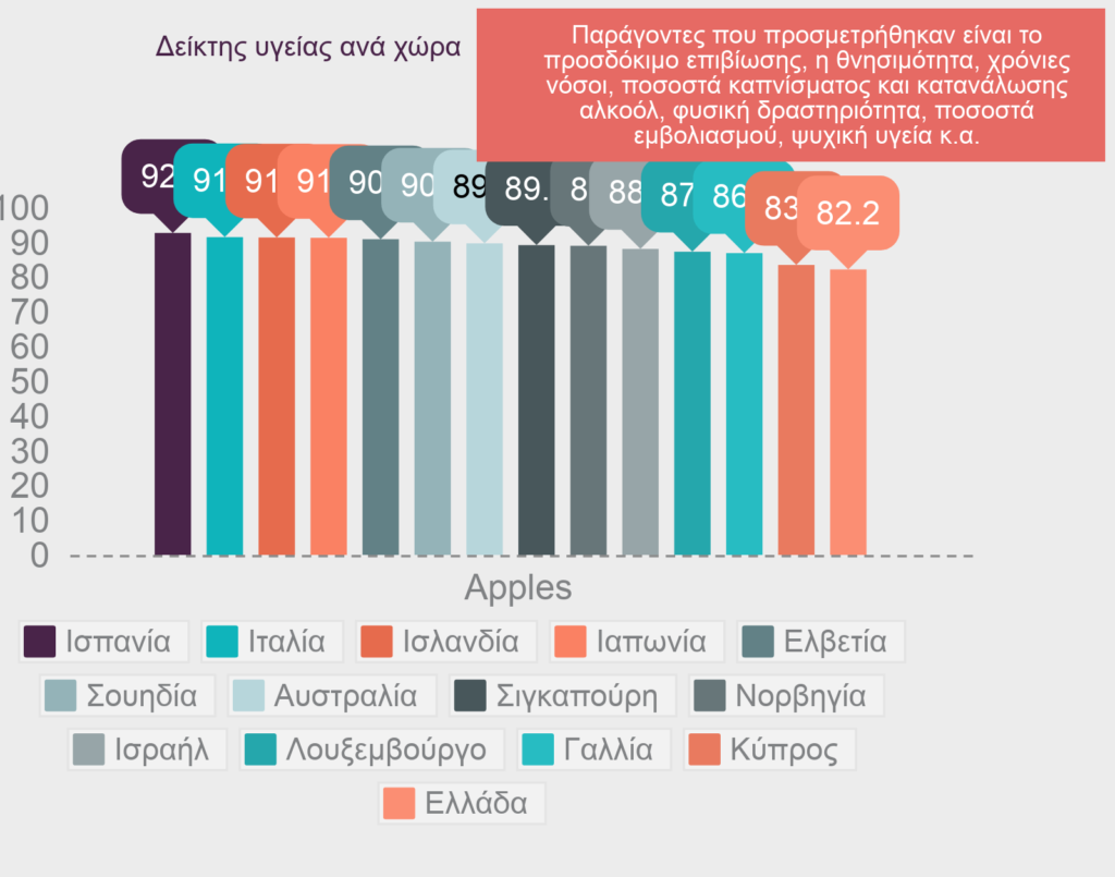 Στην 26η θέση των χωρών με τους πιο υγιείς κατοίκους κατατάσσεται η Ελλάδα σύμφωνα με τη λίστα “Healthiest Country Index” που δημοσίευσε το Bloomberg για το 2018.