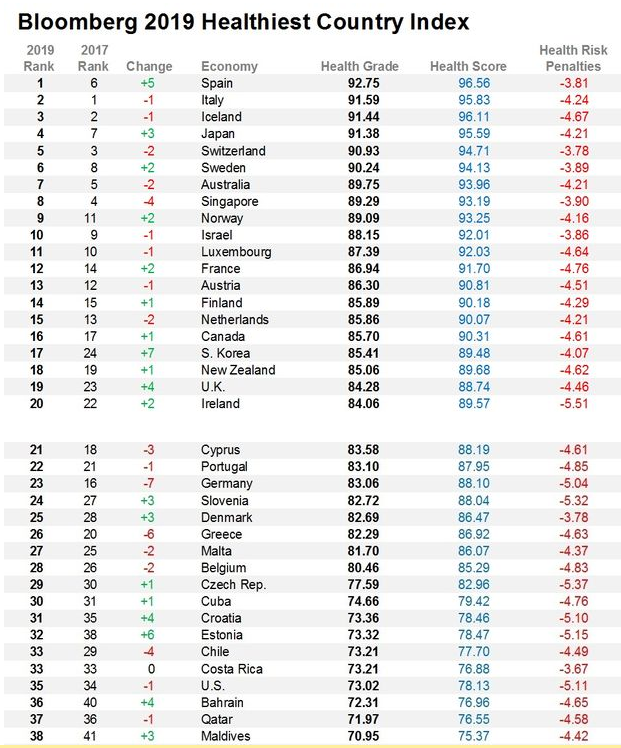 Οι ερευνητές επίσης αναφέρουν ότι οι διατροφικές συνήθειες μπορεί να παρέχουν ενδείξεις για τα επίπεδα υγείας της Ισπανίας και της Ιταλίας (2η θέση), καθώς είναι χώρες με μεσογειακή διατροφή. Στην τρίτη θέση βρίσκεται η Ισλανδία, στην 4η η Ιαπωνία και στην 5η η Ελβετία.