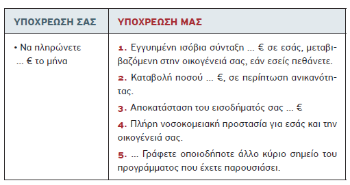 Στην αριστερή πλευρά της σελίδας γράφετε τη λέξη «Υποχρέωσή σας» να πληρώνετε …€ το μήνα. Βέβαια, η λέξη «υποχρέωση» δε χρησιμοποιείται με τη συνηθισμένη σημασία της, γιατί στην πραγματικότητα τα χρήματα που καταβάλλει ο πελάτης με το πέρας της ασφαλιστικής του περιόδου, τα λαμβάνει πίσω.