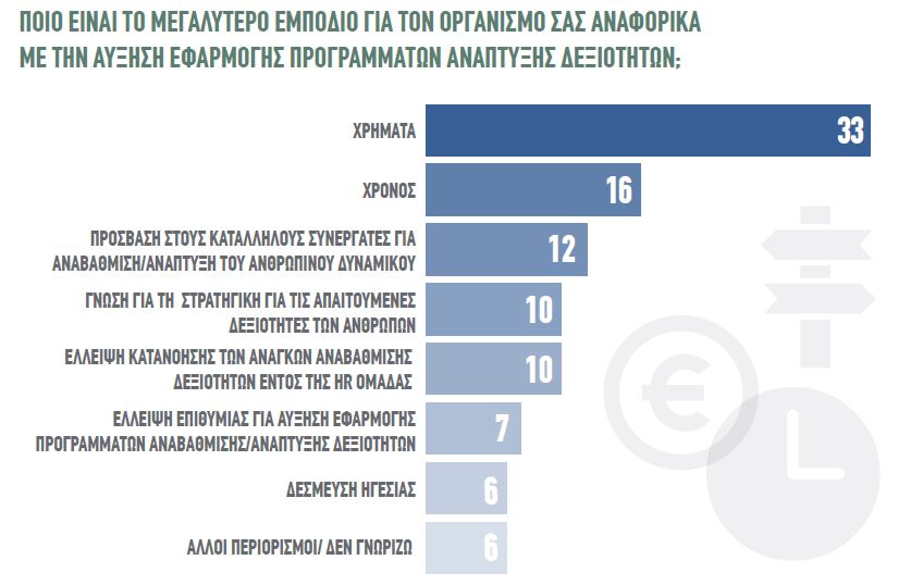 Όπως αναφέρουν οι εργοδότες, το μεγαλύτερο εμπόδιο αναφορικά με την αύξηση εφαρμογής προγραμμάτων ανάπτυξης δεξιοτήτων στον οργανισμό τους είναι: τα χρήματα (33%), ο χρόνος (16%) και η πρόσβαση στους κατάλληλους συνεργάτες για αναβάθμιση/ανάπτυξη του ανθρώπινου δυναμικού (12%).