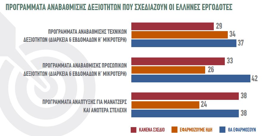 Συγκεκριμένα, το 42% των Ελλήνων εργοδοτών σχεδιάζει να υιοθετήσει προγράμματα αναβάθμισης προσωπικών δεξιοτήτων (π.χ. διαχείριση χρόνου, επικοινωνία) (διάρκειας 6 εβδομάδων ή λιγότερο), το 38% σχεδιάζει να εφαρμόσει προγράμματα ανάπτυξης για μάνατζερς και ανώτερα στελέχη και το 37% σχεδιάζει να επενδύσει σε προγράμματα αναβάθμισης τεχνικών δεξιοτήτων (διάρκειας 6 εβδομάδων ή λιγότερο).