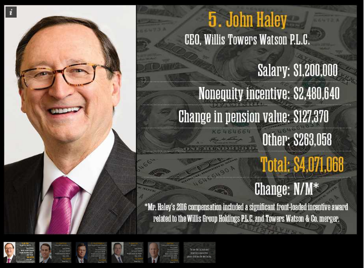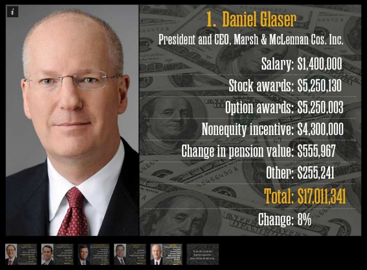 Από 4 μέχρι 17 εκατ. δολάρια τον χρόνο πάιρνουν τα πιο ακριβοπληρωμένα στελέχη των μεσιτών ασφαλίσεων. Ποσά που φαντάζουν αστρονομικά για τα ελληνικά δεδομένα και όμως υπάρχουν.