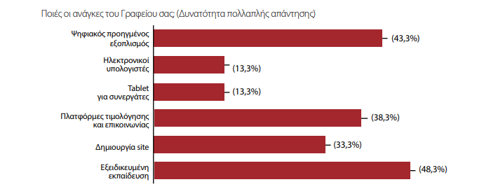 Στο ερώτημα ποιες είναι γενικά οι ανάγκες του γραφείου πέρα από το 48,3% που απαντά την εξειδικευμένη εκπαίδευση, 43,3% αναφέρεται στον ψηφιακό προηγμένο εξοπλισμό και το 38,3% σε πλατφόρμες τιμολόγησης και επικοινωνίας. Οι διαμεσολαβητές προσανατολίζονται σε μεγαλύτερο βαθμό σε νέες τεχνολογίες που μπορούν να βελτιώσουν την επικοινωνία με τον πελάτη και τις διαδικασίες που διεκπεραιώνουν. Το 33,3% θεωρεί ότι στις ανάγκες του γραφείου του είναι και η δημιουργία διαδικτυακής σελίδας, ενώ το 13,3% αναφέρεται στην αγορά ηλεκτρονικών υπολογιστών και tablets για τους συνεργάτες.