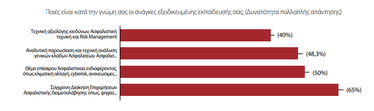 Στην έρευνα που εκπόνησε η ΕΕΑΕ για τα μέλη της σε 4 εκπαιδευτικά πεδία οι διαμεσολαβητές απαντούν κατά 40% ότι έχουν ανάγκη για εκπαίδευση στην τεχνική αξιολόγησης κινδύνων, ασφαλιστική τεχνική και Risk Management, κατά 48,3% στην Αναλυτική παρουσίαση και τεχνική ανάλυση γενικών κλάδων Ασφαλίσεων, κατά 50% σε θέματα επίκαιρου Ασφαλιστικού ενδιαφέροντος, όπως η κλιματική αλλαγή, το cyberisk, οι ανανεώσιμες πηγές ενέργειες και κατά 65% στη σύγχρονη Διοίκηση Επιχειρήσεων Ασφαλιστικής διαμεσολάβησης.