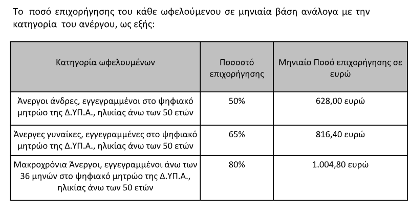 που ασκούν τακτικά οικονομική δραστηριότητα και δραστηριοποιούνται σε όλη την επικράτεια. Το ποσό επιχορήγησης του κάθε ωφελούμενου σε μηνιαία βάση ανάλογα με την κατηγορία του ανέργου, ως εξής: