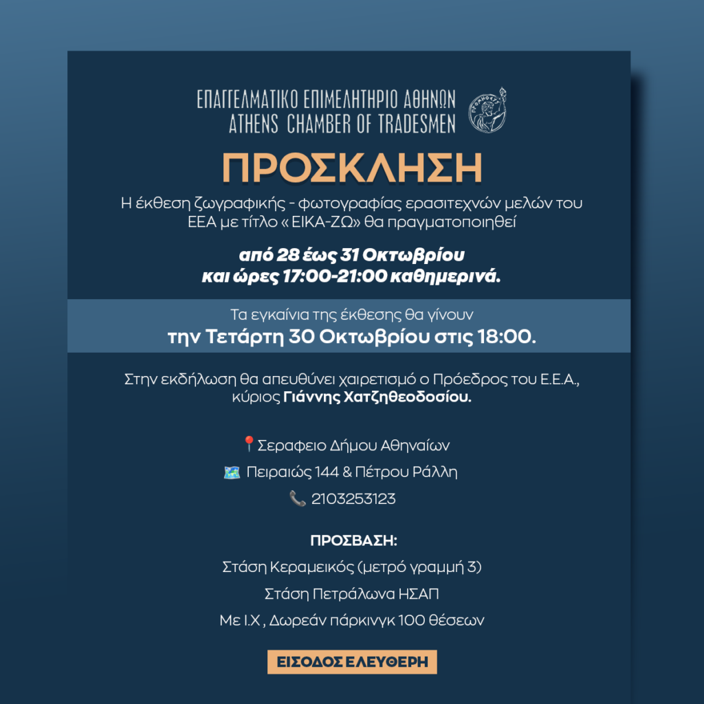 Το Επαγγελματικό Επιμελητήριο Αθηνών και η Δημιουργική Ομάδα Καλλιτεχνών του Ε.Ε.Α. πραγματοποιούν, 28-31/10, την πρώτη τους έκθεση ζωγραφικής & φωτογραφίας, στο «ΣΕΡΑΦΕΙΟ» Κέντρο Πολιτισμού του Δήμου Αθηναίων, εγκαινιάζοντας έτσι την έναρξη των πολιτιστικών του δραστηριοτήτων με αποκλειστική συμμετοχή των μελών του, που ασχολούνται ερασιτεχνικά με τις τέχνες.