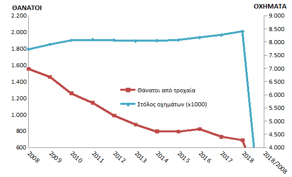 Σύμφωνα με τα στοιχεία του Παρατηρητηρίου Οδικής Ασφάλειας του Ε.Μ.Π. (NTUA Road Safety Observatory), που επεξεργάζεται δεδομένα της ΕΛ.ΣΤΑΤ., κατά το 2018 οι θάνατοι από τροχαία ατυχήματα στην Ελλάδα παρουσίασαν σημαντική μείωση, για δεύτερη διαδοχική χρονιά, κατά 5,6% σε σύγκριση με το 2017. Η μείωση αυτή μπορεί να αποδοθεί τόσο στην επιρροή της οικονομικής κρίσης όσο και στην κατασκευή και χρήση 500 χιλιομέτρων νέων και αναβαθμισμένων αυτοκινητοδρόμων σε θέσεις εθνικών οδών που είχαν υψηλά ποσοστά θανατηφόρων τροχαίων ατυχημάτων. Την τελευταία δεκαετία, η χώρα μας παρουσιάζει τη μεγαλύτερη βελτίωση στην οδική ασφάλεια εντός των χωρών της Ε.Ε. με μείωση των θανάτων κατά 56% και των σοβαρών τραυματισμών κατά 60%.