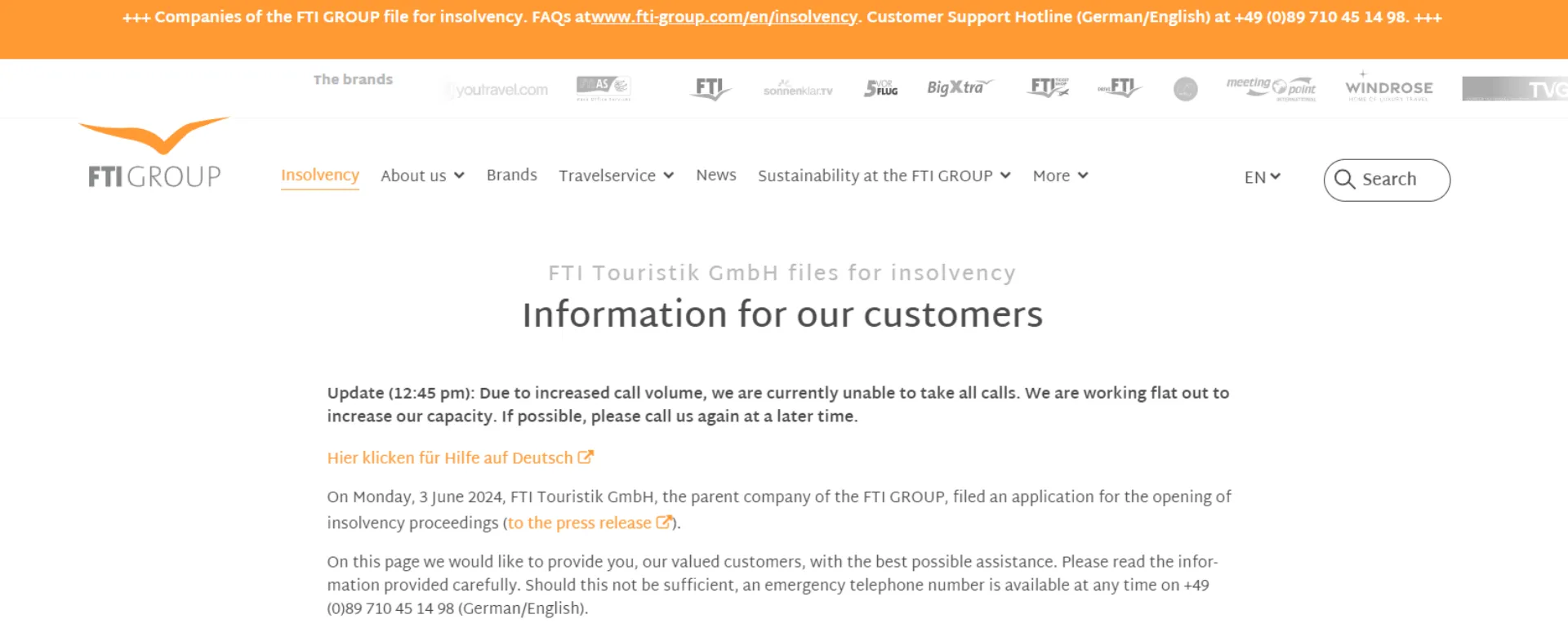 Σε ανακοίνωση στην ιστοσελίδα του FTI αναφέρονται τα εξής: “Η υποστήριξη των ταξιδιωτών που πλήττονται από τις συνέπειες της αφερεγγυότητας αποτελεί πλέον ύψιστη προτεραιότητα για την FTI GROUP. Έχει ήδη δημιουργηθεί ένας δικτυακός τόπος υποστήριξης στη διεύθυνση www.fti-group.com/en/insolvency καθώς και μια τηλεφωνική γραμμή υποστήριξης στον αριθμό +49 (0) 89 / 710 45 14 98. Όλες οι σχετικές πληροφορίες είναι προσβάσιμες εδώ, ενώ υπάρχουν γερμανο- και αγγλόφωνοι υπεύθυνοι επικοινωνίας για μεμονωμένες ερωτήσεις. Εκτός από την πλήρη εστίαση στην υποστήριξη των πελατών, η FTI GROUP θα ενημερώνει επίσης τακτικά τους επισκέπτες της μαζί με το Γερμανικό Ταμείο Ταξιδιωτικής Ασφάλειας (DRSF).