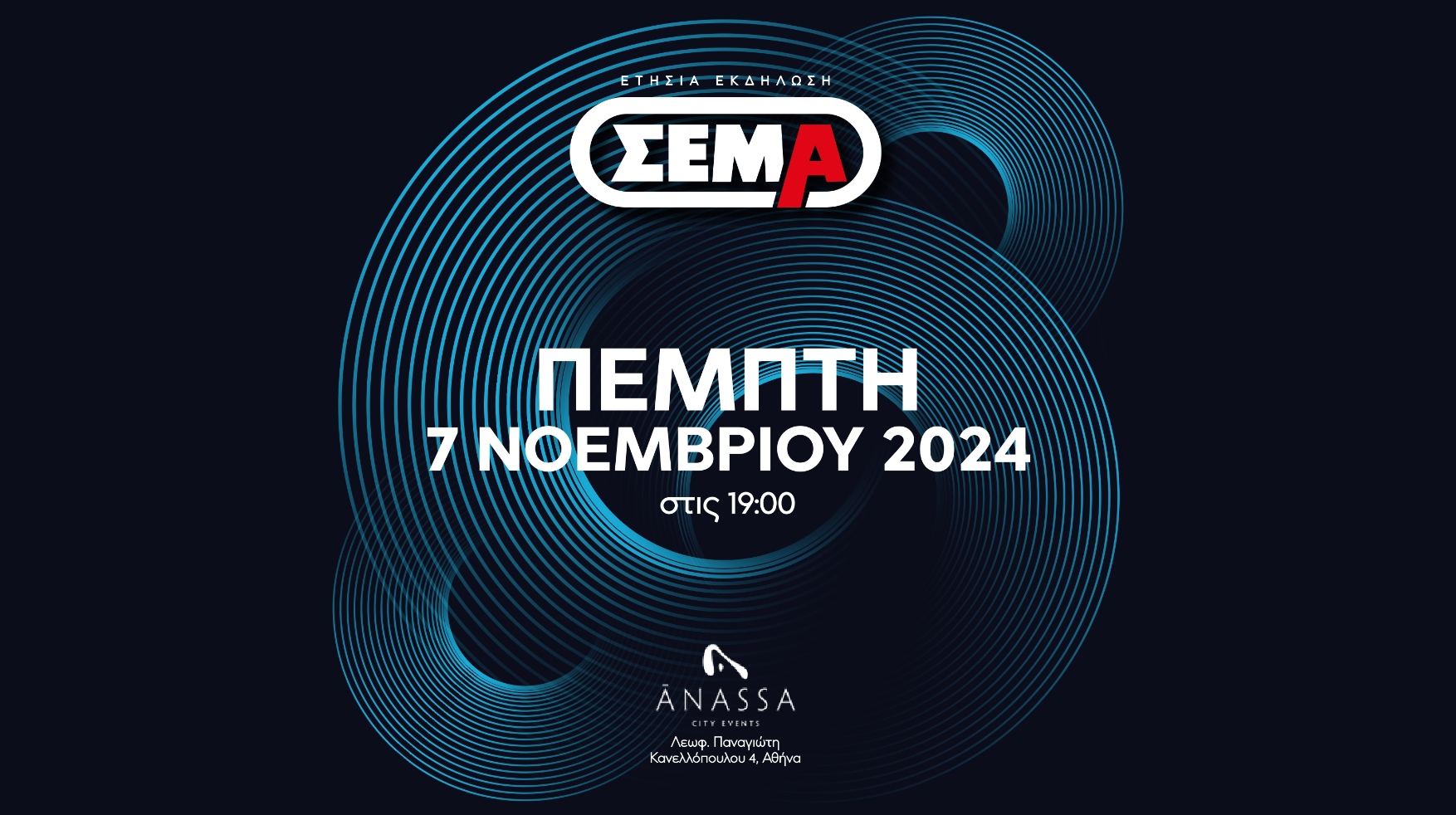 Στόχος της φετινής εκδήλωσης είναι να βρεθούμε όλοι εκ νέου, να μοιραστούμε τις ιδέες μας, να συντονίσουμε τις ενέργειες μας και να καθορίσουμε το μέλλον μας. Ο ΣΕΜΑ διανύει μια λαμπρή περίοδο, είναι πιο δραστήριος και πιο δυνατός από ποτέ, ανοίγει ένα νέο κύκλο δράσεων και επιταχύνει τις αλλαγές. Για τον λόγο αυτό, επανασχεδιάζουμε τα πάντα εκτός από τον αξιακό μας κώδικα. Αλλάζουμε ακόμα και το λογότυπο μας, καθώς θέλουμε το νέο σήμα του ΣΕΜΑ να αποτελέσει τον πρεσβευτής μας σε αυτό που ονομάζουμε “Νέας εποχή” και με χαρά θα το αποκαλύψουμε στην εκδήλωσή μας στις 7 Νοεμβρίου 2024 στις 19.00 στο Anassa City Events, μια εκδήλωση σχεδιασμένη από την αρχή, με κάθε λεπτομέρεια. Σας περιμένουμε όλους εκεί!