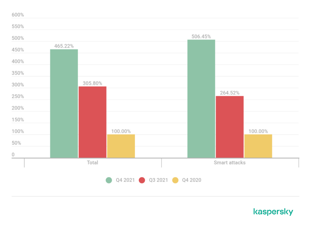 Σε σύγκριση με το τρίτο τρίμηνο του 2021, ο συνολικός αριθμός των επιθέσεων DDoS το τέταρτο τρίμηνο παρουσίασε αύξηση της τάξης του 52%. Το ποσοστό αυτό είναι 4,5 φορές μεγαλύτερο σε σύγκριση με την αντίστοιχη περίοδο του προηγούμενου έτους. Αυτά και πολλά επιπλέον ευρήματα δημοσιεύτηκαν στη νέα έκθεση της Kaspersky για τις επιθέσεις DDoS το τέταρτο τρίμηνο του 2021.