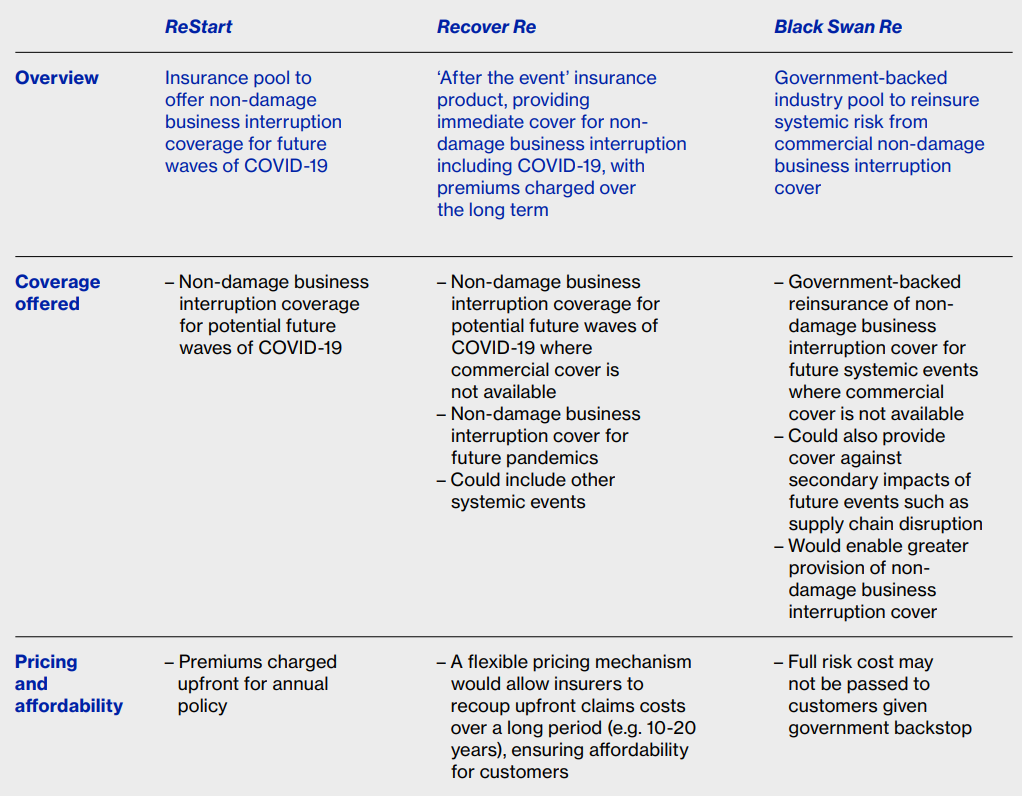 Σε έκθεσή τους οι Lloyd’s αναφέρονται στο πως μπορεί να αντιμετωπιστεί μια μελλοντική πανδημία μέσα από ένα μοντέλο οργανισμών σύμπραξης του δημοσίου και του ιδιωτικού τομέα, κάνοντας λόγο για δύο φορείς τους Recover Re και BlackSwang Re, καθώς και ένα ασφαλιστικό προιόν το Restart.
