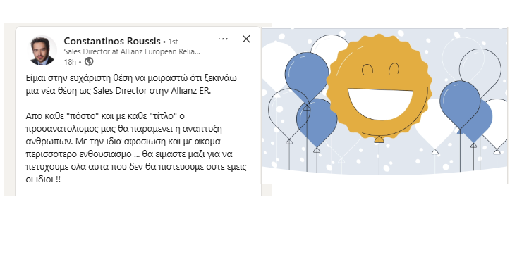 Τη θέση Sales Director στην Allianz ER αναλαμβάνει ο Κωνσταντίνος Ρούσσης. Όπως αναφέρει σε σχετική ανάρτηση σε μέσο επαγγελματικής δικτύωσης “από κάθε “πόστο” και με κάθε “τίτλο” ο προσανατολισμός μας θα παραμένει η ανάπτυξη ανθρώπων. Με την ίδια αφοσίωση και με ακόμα περισσότερο ενθουσιασμό … θα είμαστε μαζί για να πετύχουμε όλα αυτά που δεν θα πιστεύουμε ούτε εμείς οι ίδιοι”.