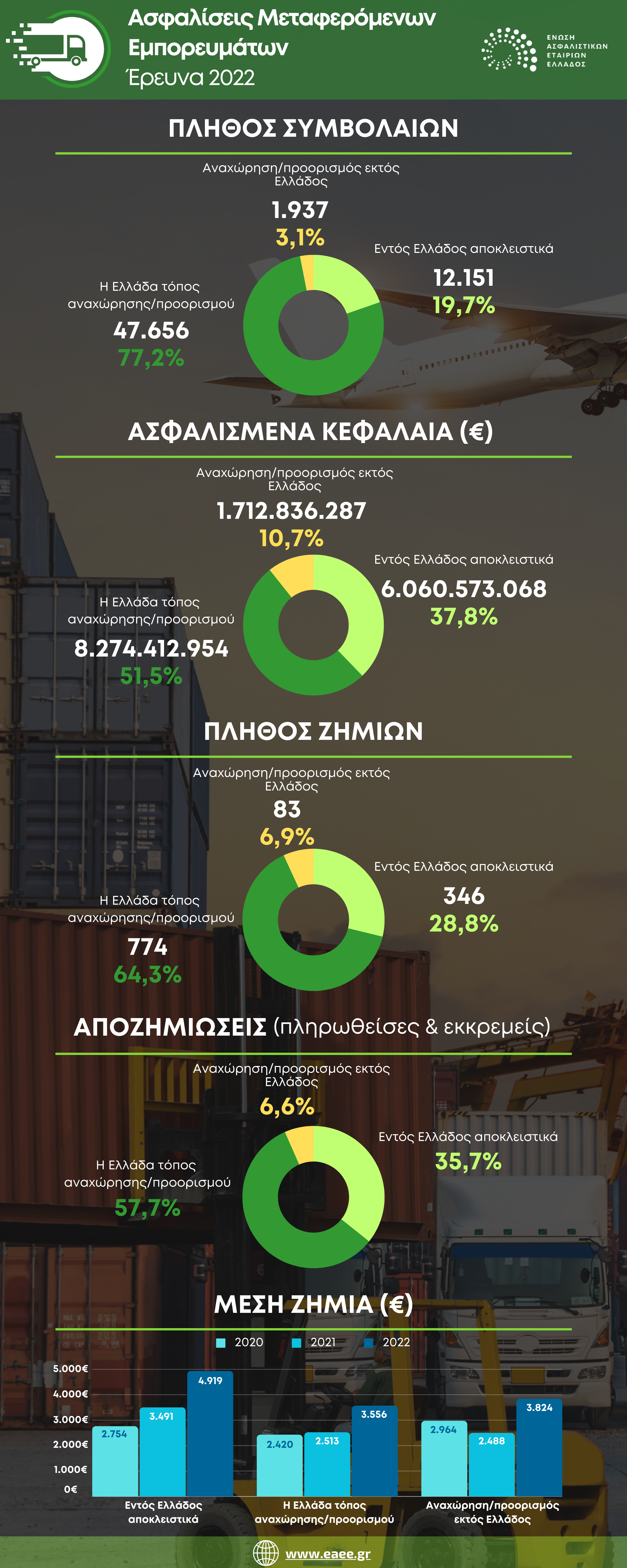 Συνολικά 47.656 ασφαλίσεις έγιναν για εμπορεύματα τα οποία μεταφέρθηκαν με περιοχή προορισμού / αναχώρησης την Ελλάδα, 12.151 ασφαλίσεις αφορούσαν εμπορεύματα που μεταφέρονταν αποκλειστικά εντός της Ελλάδας και 1.937 ήταν συμβόλαια για μεταφερόμενα εμπορεύματα όπου η περιοχή αναχώρησης / προορισμού ήταν εκτός Ελλάδος. Περίπου το 50% των ασφαλισμένων κεφαλαίων ήταν για εμπορεύματα με τόπο αναχώρησης/προορισμού την Ελλάδα και περίπου 6 δις για μεταφορές αποκλειστικά εντός των συνόρων.