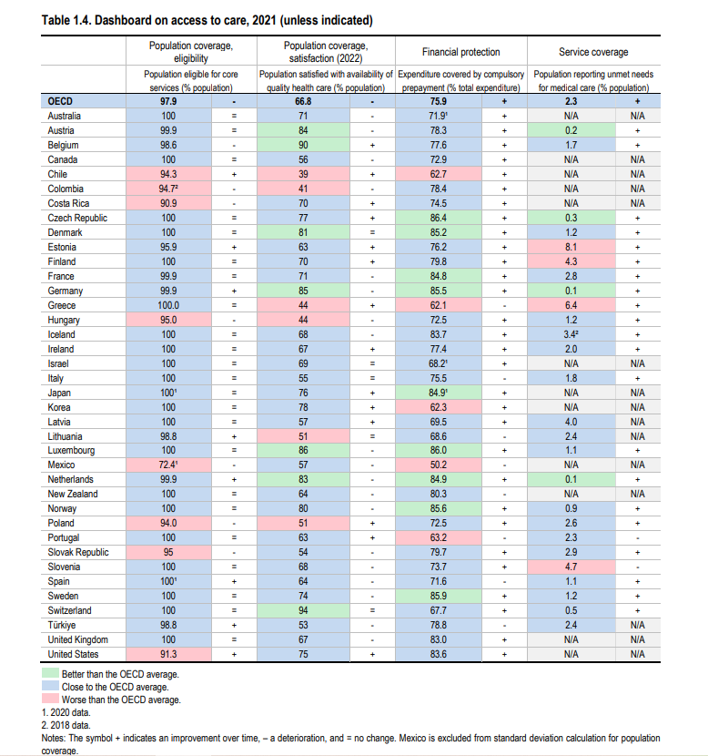 Και στους τρεις προαναφερθέντες δείκτες η χώρα μας βρίσκεται σε χειρότερη θέση από τον μέσο όρο του ΟΟΣΑ. Παρατηρώντας τον πίνακα με τα στοιχεία βλέπουμε ότι σε κατάταξη όσον αφορά την ικανοποίηση των πολιτών είμαστε η τρίτη χώρα με τη χειρότερη θέση μετά τη Χιλή και την Κολομβία. Σε επίπεδο οικονομικής προστασίας και κάλυψης των δαπανών μέσω υποχρεωτικού σχήματος είμαστε η δεύτερη χώρα με τη χειρότερη θέση μετά το Μεξικό.