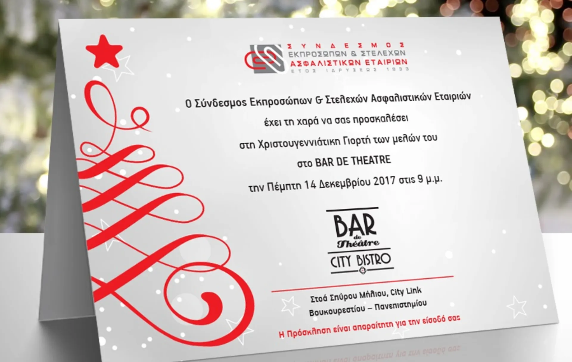 Με το σύνθημα αυτό, ο Σύνδεσμος Εκπροσώπων & Στελεχών Ασφαλιστικών Εταιριών καλεί τα Μέλη και τους φίλους του στη χριστουγεννιάτικη γιορτή που διοργανώνει την Πέμπτη, 14 Δεκεμβρίου 2017, στις 9 μ.μ. στο BAR DE THEATRE (Βουκουρεστίου – Πανεπιστημίου, Citylink, Στοά Σπύρου Μήλιου, Αθήνα),
