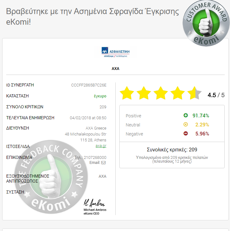 Μόλις αυτές συγκεντρωθούν, ελέγχονται από την ομάδα Διαχείρισης Ανατροφοδότησης της eKomi και έπειτα δημοσιεύονται online και συνδέονται με όλες τις κυριότερες μηχανές αναζήτησης. Ήδη η ΑΧΑ έχει βραβευτεί με την ασημένια σφραγίδα έγκρισης της eKomi.