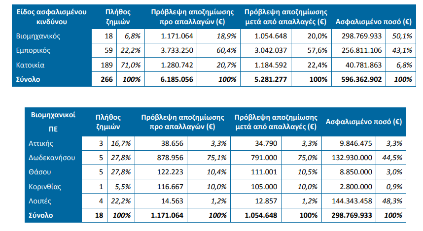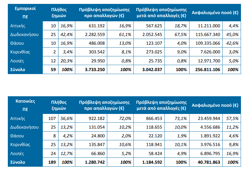Οι συμμετέχουσες στην έρευνα ασφαλιστικές επιχειρήσεις δήλωσαν ζημιές σε ακίνητα όλων των κατηγοριών (κατοικίες, εμπορικοί κίνδυνοι, βιομηχανικοί κίνδυνοι) με συνολική ασφαλισμένη αξία 596 εκατ. €. Περισσότερο επλήγησαν τα ακίνητα που βρίσκονταν στα Δωδεκάνησα, στις Περιφερειακές Ενότητες (ΠΕ) Ρόδου και Κω (ασφαλισμένη αξία 253 εκατ. €), στην ΠΕ Θάσου (ασφαλισμένη αξία 120 εκατ. €) και στην ΠΕ Αττικής (ασφαλισμένη αξία 45 εκατ. €). Εξ΄ αιτίας των ακραίων καιρικών φαινομένων, δηλώθηκαν συνολικά στις συμμετέχουσες ασφαλιστικές επιχειρήσεις 266 ζημιές επί των ασφαλίσεων περιουσίας με ποσό πρώτης εκτίμησης για αποζημίωση της τάξης των 6,2 εκατ. €, άρα η μέση δηλωθείσα ζημία2 φθάνει τα 23.252 €. Για τις εν λόγω ζημιές, η εκτίμηση των αποζημιώσεων μετά τις απαλλαγές (όπου υφίστανται) ήταν 5,3 εκατ. €.