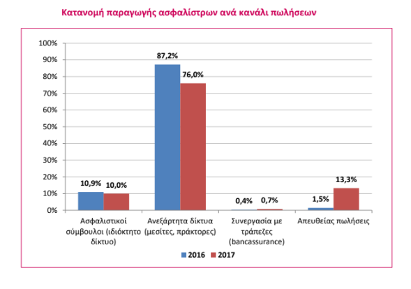 Σύμφωνα με έρευνα της ΕΑΕΕ η παραγωγής του κλάδου ανά κανάλι διανομής είχε ως εξής: τα ανεξάρτητα δίκτυα (μεσίτες, πράκτορες) συμμετέχουν κατά 76%, οι απευθείας πωλήσεις 13,3%, οι ασφαλιστικοί σύμβουλοι (ιδιόκτητο δίκτυο) 10,0%, και η συνεργασία με τις τράπεζες (bancassurance) συμμετέχει με 0,7% επί του συνόλου.