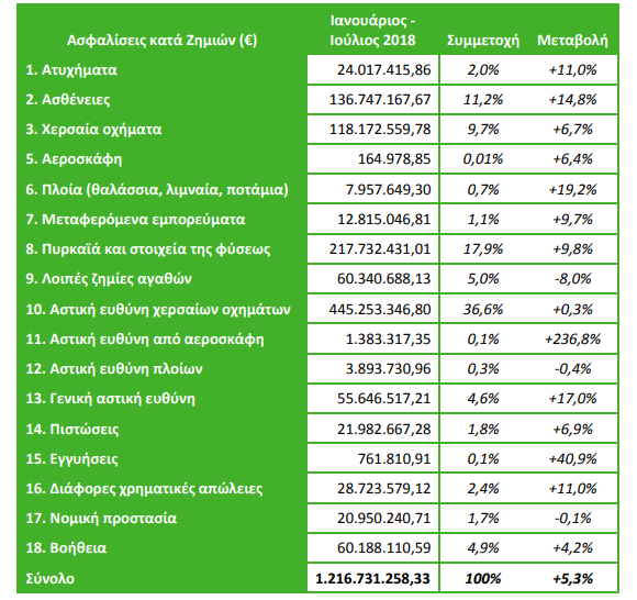 Ομοίως, οι ασφαλίσεις κατά Ζημιών κατέγραψαν αύξηση (+2,7%) για έβδομο συνεχόμενο μήνα. Συνολικά, η παραγωγή ασφαλίστρων μηνός Ιουλίου αυξήθηκε κατά 9,7%, έναντι του Ιουλίου του 2017.