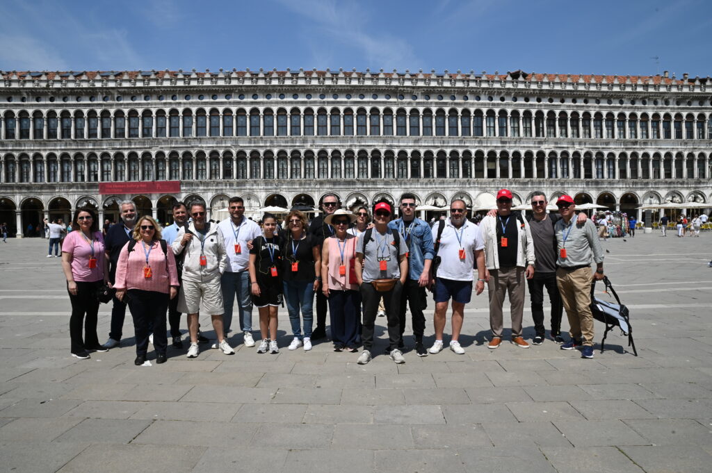 Ακολούθησε η περιήγησή τους στο πλέον γνωστό τοπόσημο, αυτό της Πλατείας του Αγίου Μάρκου με την σπάνιας θρησκευτικής και καλλιτεχνικής αξίας Βασιλική με τους πέντε τρούλους. Οι συμμετέχοντες ξεναγήθηκαν στο κέντρο της Βενετίας για να θαυμάσουν το Campanile, το μεγαλοπρεπές καμπαναριό της πόλης και τον Πύργο του Ρολογιού με τα περίτεχνα σχέδια και το φημισμένο Φτερωτό Λιοντάρι του Αγίου Μάρκου.