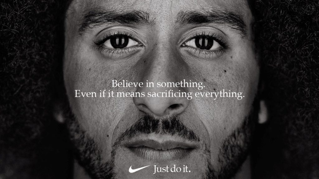Η Nike αποφάσισε να χρησιμοποιήσει στην καμπάνια για τα 30 χρόνια της σαν κεντρικό πρόσωπο τον αθλητή Colin Kaepernick με το γνωστό της μήνυμα “just do it”. Ο Kaepernick είναι ένας από τους αθλητές που γονάτιζαν στο γήπεδο για να διαμαρτυρηθούν σχετικά με τους πυροβολισμούς άοπλων μαύρων πολιτών από την αστυνομία. Παρόλο που στη διαφήμιση δεν υπάρχει καμία σύνδεση με τη διαμαρτυρία, επειδή το πρόσωπο του Kaepernick συνδέθηκε σε τέτοιο βαθμό με το εν λόγω κίνημα διαμαρτυρίας η σύνδεση ήταν κατά τρόπο αυτονόητη.