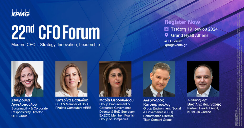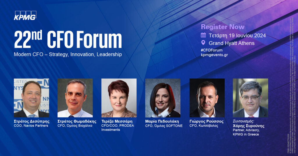Το 22ο CFO Forum της KPMG στην Ελλάδα επιστρέφει την Τετάρτη 19 Ιουνίου, με κεντρικό μήνυμα “Modern CFO – Strategy, Innovation, Leadership”, καλωσορίζοντας όλα τα Οικονομικά Στελέχη της αγοράς σε μια συναρπαστική ημέρα συζητήσεων, παρουσιάσεων, ανταλλαγής απόψεων και networking. Το συνέδριο θα αναδείξει τη διαρκώς αυξανόμενη και μεταβαλλόμενη σημασία του ρόλου του CFO και θα παρουσιάσει τις βέλτιστες πρακτικές για την προώθηση της ανάπτυξης, μέσω της διαχείρισης των επιχειρηματικών κινδύνων, την αύξηση της παραγωγικότητας και την υιοθέτηση του ψηφιακού μετασχηματισμού.