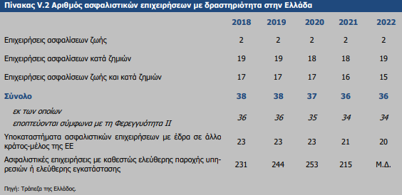 Τα εν λόγω στοιχεία αναφέρονται στη Έκθεση Χρηματοπιστωτικής Σταθερότητας της ΤΤΕ στην οποία “χαρτογραφείται” η αγορά της ιδιωτικής ασφάλισης βάσει των μεγεθών του 2022 για 36 ασφαλιστικές επιχειρήσεις, εκ των οποίων οι 2 δραστηριοποιούνται στη ζωή, οι 19 στον κλάδο ζημιών, οι 15 σε κλάδους ζωής και ζημιών.