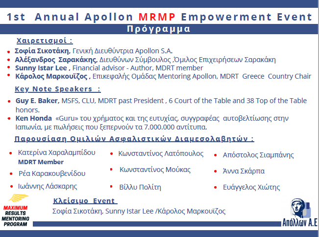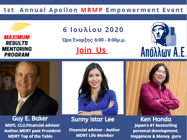 Στις 6 Ιουλίου θα διεξαχθεί ηλεκτρονικά το “Maximum Results Mentoring Program” της Απόλλων, στο οποίο θα συμμετέχουν ως ομιλητές οι Gyu E.Baker (MSGS, CLU, Financial Advisor, Author, MDRT past president, MDRT Top of the Table), Sunny Istal Gee (Financial Advisor, Author , MDRT Life Member) και Ken Honda (Japan’s #1 bestselling, personal development, Hapiness & Money Guru).