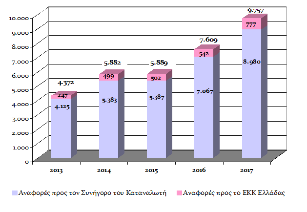 Η Αρχή μας δέχθηκε 9.757 αναφορές το 2017. Υπήρξε αύξηση κατά 28,3% σε σχέση με το 2016. Από τις παραπάνω αναφορές, οι 777 υποβλήθηκαν στο Ευρωπαϊκό Κέντρο Καταναλωτή Ελλάδος, που λειτουργεί υπό την εποπτεία του Συνηγόρου και έχει ως αρμοδιότητα τη διαμεσολάβηση μεταξύ καταναλωτών και προμηθευτών από διαφορετικά κράτη-μέλη της Ευρωπαϊκής Ένωσης. Η αύξηση του αριθμού των υποθέσεων είναι συνεχής τα τελευταία χρόνια. Μόνο το 2015 υπήρξε ανάσχεση της αύξησης, λόγω της επιβολής περιορισμών στην κίνηση κεφαλαίων (capital controls). Υπολογίστε ότι το 2013 η Αρχή δέχτηκε 4.372 υποθέσεις και τώρα σχεδόν 10.000. Αύξηση 123%. Υπερδιπλασιασμός.