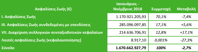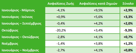 Τον Νοέμβριο του 2018 σε σύγκριση με τον αντίστοιχο μήνα του 2017, οι ασφαλίσεις Ζωής μείωσαν την παραγωγή τους κατά 1,4% για τέταρτο συνεχόμενο μήνα. Αντιθέτως, οι ασφαλίσεις κατά Ζημιών κατέγραψαν αύξηση (+3,8%). Συνολικά, η παραγωγή ασφαλίστρων μηνός Νοεμβρίου αυξήθηκε κατά 1,2%, έναντι του Νοεμβρίου του 2017.