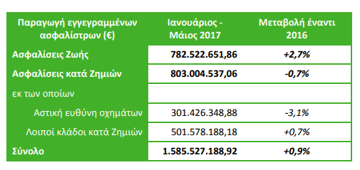 Τον Μάιο του 2017 σε σύγκριση με τον αντίστοιχο μήνα του 2016, οι ασφαλίσεις Ζωής αύξησαν την παραγωγή τους σε μηνιαία βάση (+3,6%).